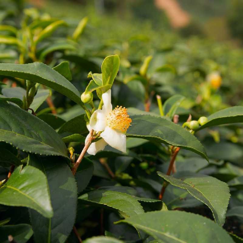 Le Camellia sinensis, ou théier, est un arbuste originaire d’Asie du Sud-Est, cultivé depuis des millénaires pour la production de thé vert, noir et blanc. La plante présente un port buissonnant et compact, au feuillage persistant, vert foncé, brillant et finement dentelé. Ses fleurs blanches et parfumées apparaissent à l’automne, offrant également un intérêt ornemental.